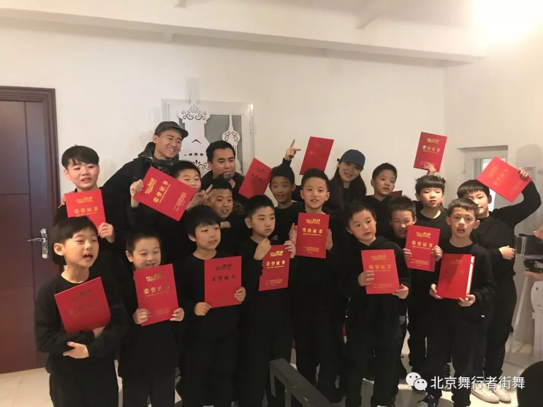 手持证书的宝贝们与街舞委员会秘书长罗斌老师(第二排左三),副主席冯双白老师(第二排右二),陈爱莲老师(第二排右三)合影。