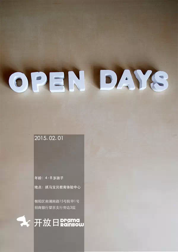 时间2015年2月1日上午场 9:30-12:30 下午场 14:00-17:00地点抓马宝贝教育体验中心|北京市朝阳区南湖南路15号院甲1号年龄上午场 4-5岁孩子家庭下午场 5-8岁孩子家庭参与方式编辑短信“开放日+孩子姓名+孩子年龄+家长姓名+时间”到13264245610